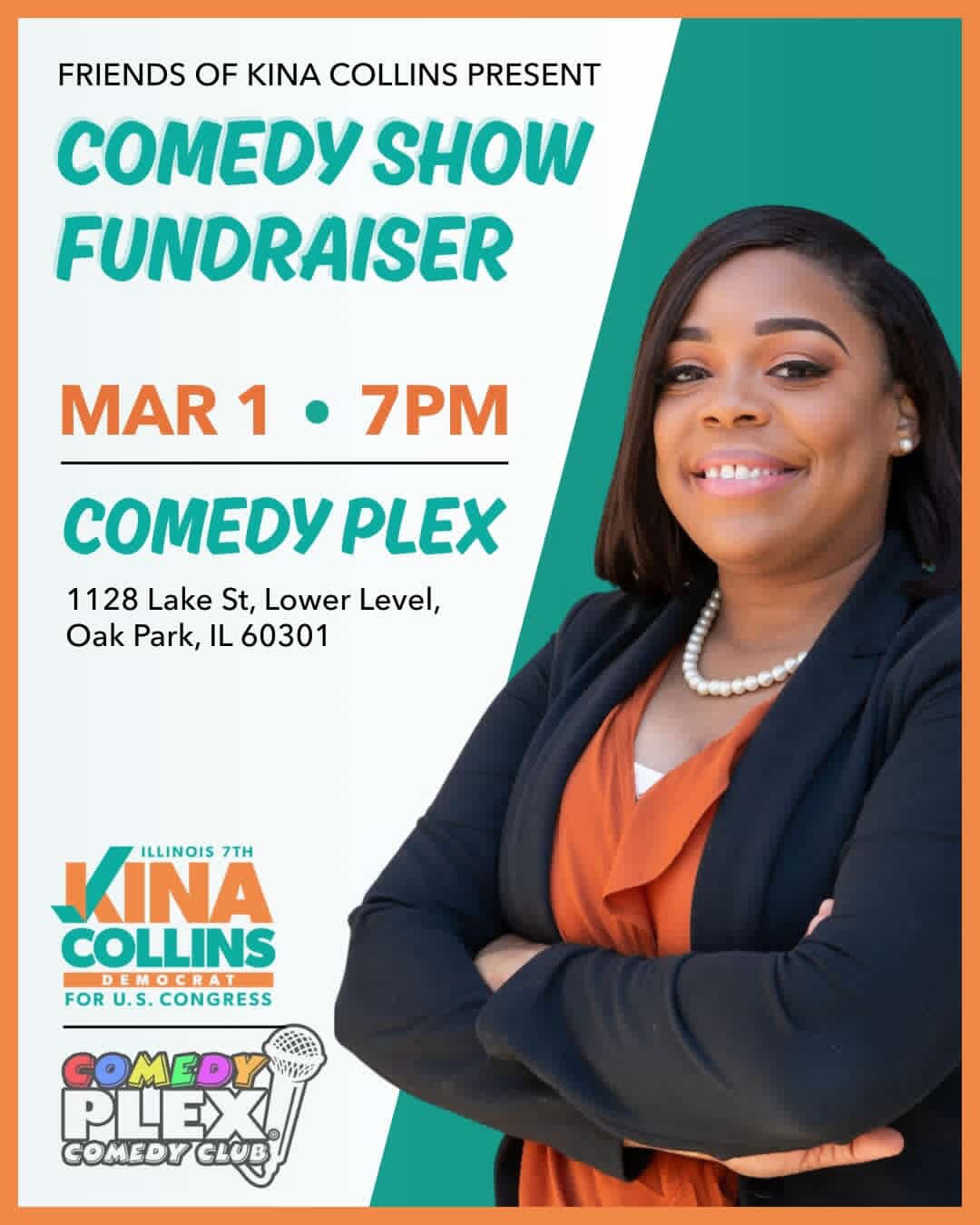 Get ready to laugh for a cause as the Friends of Congressional Candidate Kina Collins brings a powerhouse comedy fundraiser to Comedy Plex Comedy Club in downtown Oak Park!