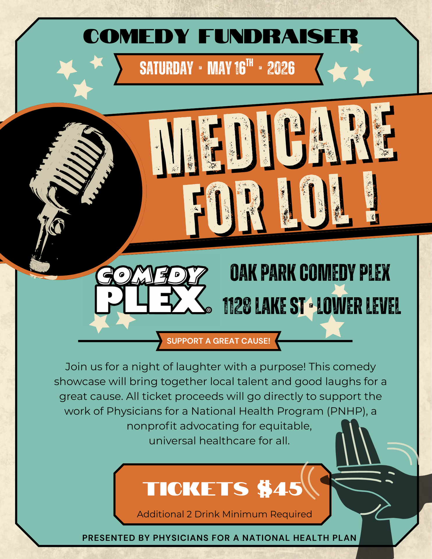 Join us for a night of laughter with a purpose! This comedy showcase will bring together local talent and good laughs for a great cause. All ticket proceeds will go directly to support the work of Physicians for a National Health Program (PNHP), a nonprofit advocating for equitable, universal healthcare for all.